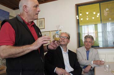 Von «Kunst auf Leinwand» meint er nichts zu verstehen - zweifellos aber von der Kunst des Brauens: Anton Welti (links) erläutert die Ingredienzen seines Rezeptes für das «Van-Ueli-Bier» (Mitte: Kunstmuseums-Direktor Bernhard Mendes Bürgi; rechts: Urs Reimann, Verwaltungsdirektor des Kunstmuseums Basel). Foto: J.-P. Lienhard, Basel © 2009