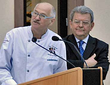 Und das ist der Beizer Tony Hartmann, an dem ist vieles originell, nicht nur sein Brillengestell: Bürgermeister Ueberschlag schaut kritisch und achtsam, damit sich der Glacé-König und Erfinder von Choucroute-Glacé und -Schnaps in seiner Ansprache wirklich kurz fasst…