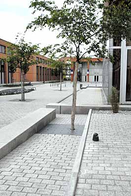 Was macht denn da der Baum mitten in der Rollstuhl-Auffahrtrampe? Steht er da, damit der Behinderte sich beim hinunterfahren daran rettend halten kann? Und wie kommt der Rollstuhlfahrer unten um die rechtwinklige Ecke? Ist da eventuell die Drehscheibe vergessen worden einzubauen? Rechts im Bild einer der Stolperfallen am Tag.