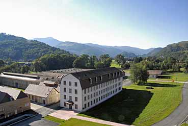 Blick von der Aussichtsplattform im 7. Stock des Trockenturmes auf die ehemaligen Fabrikgebäude und zu den Vogesen Richtung Wildenstein: Die mehrstöckigen Bauten sind die älteren aus vorrevoutionärer Zeit, als noch auf hölzernen Webstühlen gearbeitet wurde. Weil die Textilmaschinen später aus Stahl konstruiert und damit schwerer wurden, baute man ebenerdige Fabrikhallen mit den typischen gezackten Sheddächern, wie sie in Manchester aufkamen (im Hintergrund).