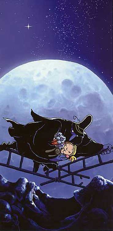 Die Heldin des Buches, Tiffany, wohlbehütet und selig schlafend in den Armen des gruselichsten der drei Räuber.