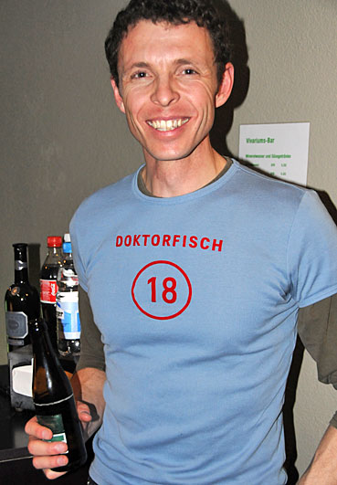 Der Doktorfisch und der Vehdoktor sind beides exotische Bezeichnungen: Erstere für einen Fisch im Aquarium Nummer 18 des Zolli-Vivariums und zweitere für die durchaus ehrenwert gemeinte elsässische Bezeichnung für einen hierzulande hochdeutsch geheissenen «Tierarzt», der hier in der Person von Christian Wenker die Flasche schwenkt…